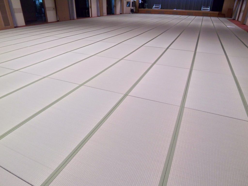大広間に「軽量・強化畳」を納入させていただきました。たさまざまな用途に使われる大広間。畳をしいたり、めくってじゅうたんに変えたり。スタッフの方からもっと軽くて運びやすく、丈夫な畳はないだろうか…とのお声が。ホテルのご担当者様と何度も何度も打ち合わせを繰り返し、試作、試供を重ね、約半年かけて納品にいたりました。軽くて丈夫な芯材(特殊な材料)を使用し、裏面には滑り止め加工を施しました。何より、ご要望どおり!と喜んでいただけたことが嬉しかったですね。(前田)