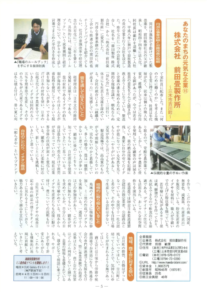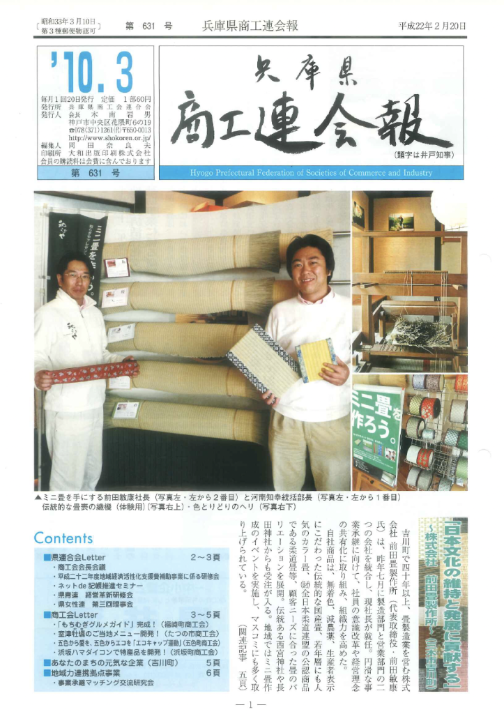 【メディア掲載|新聞】兵庫県商工連会報に掲載されました メディア掲載 ●媒体名 兵庫県商工連会報 ●日付 2010.2.20 ●備考 畳のことをもっと知ってもらうために。 前田畳製作所は多くのメディアで紹介されています。自社の紹介ということではなく、畳のことをもっとみなさまにしってもらえる機会をつくりたいと考えています。 Post navigation 前の記事 次の記事 関連記事 【メディア掲載|ウェブ】リクシルオーナーズクラブに… 【メディア掲載|テレビ】NHKで取り上げていただき… 【メディア掲載|新聞】朝日新聞に掲載されました メディア掲載一覧 【メディア掲載|ラジオ】ラジオ関西「時間です!林編… 【メディア掲載|新聞】読売新聞(朝刊)くらし面に掲… 【メディア掲載|新聞】神戸新聞に掲載されました 【メディア掲載|新聞】神戸市タブロイド紙表紙に掲載… 【メディア掲載|新聞】朝日新聞に掲載されました