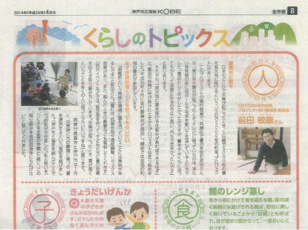 【メディア掲載|新聞】神戸市広報紙に掲載されました メディア掲載 ●媒体名 神戸市広報紙 ●日付 2014.4 ●備考 畳のことをもっと知ってもらうために。 前田畳製作所は多くのメディアで紹介されています。自社の紹介ということではなく、畳のことをもっとみなさまにしってもらえる機会をつくりたいと考えています。 Post navigation 前の記事 次の記事 関連記事 【メディア掲載|ウェブ】リクシルオーナーズクラブに… 【メディア掲載|テレビ】NHKで取り上げていただき… 【メディア掲載|新聞】朝日新聞に掲載されました メディア掲載一覧 【メディア掲載|ラジオ】ラジオ関西「時間です!林編… 【メディア掲載|新聞】読売新聞(朝刊)くらし面に掲… 【メディア掲載|新聞】神戸新聞に掲載されました 【メディア掲載|新聞】神戸市タブロイド紙表紙に掲載… 【メディア掲載|新聞】朝日新聞に掲載されました
