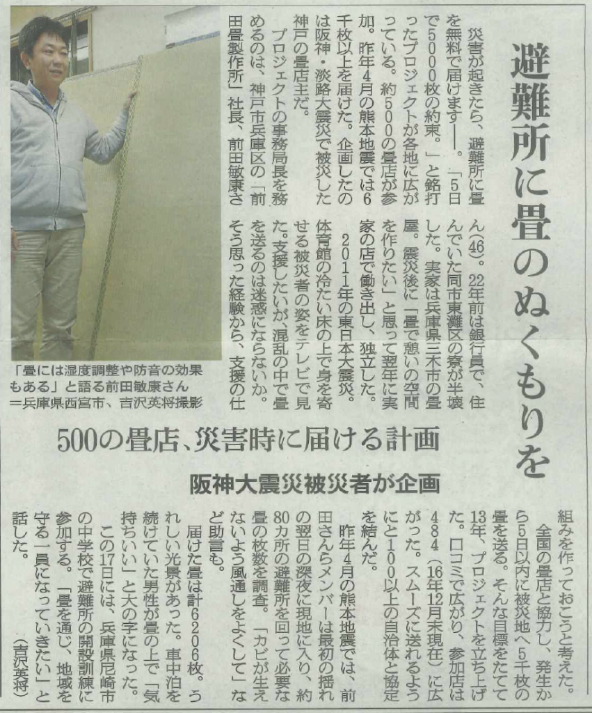 【メディア掲載|新聞】朝日新聞に掲載されました メディア掲載 ●媒体名 朝日新聞 ●日付 2017.1.14 ●備考 畳のことをもっと知ってもらうために。 前田畳製作所は多くのメディアで紹介されています。自社の紹介ということではなく、畳のことをもっとみなさまにしってもらえる機会をつくりたいと考えています。 Post navigation 前の記事 次の記事 関連記事 【メディア掲載|ウェブ】リクシルオーナーズクラブに… 【メディア掲載|テレビ】NHKで取り上げていただき… 【メディア掲載|新聞】朝日新聞に掲載されました メディア掲載一覧 【メディア掲載|ラジオ】ラジオ関西「時間です!林編… 【メディア掲載|新聞】読売新聞(朝刊)くらし面に掲… 【メディア掲載|新聞】神戸新聞に掲載されました 【メディア掲載|新聞】神戸市タブロイド紙表紙に掲載… 【メディア掲載|新聞】神戸新聞に掲載されました
