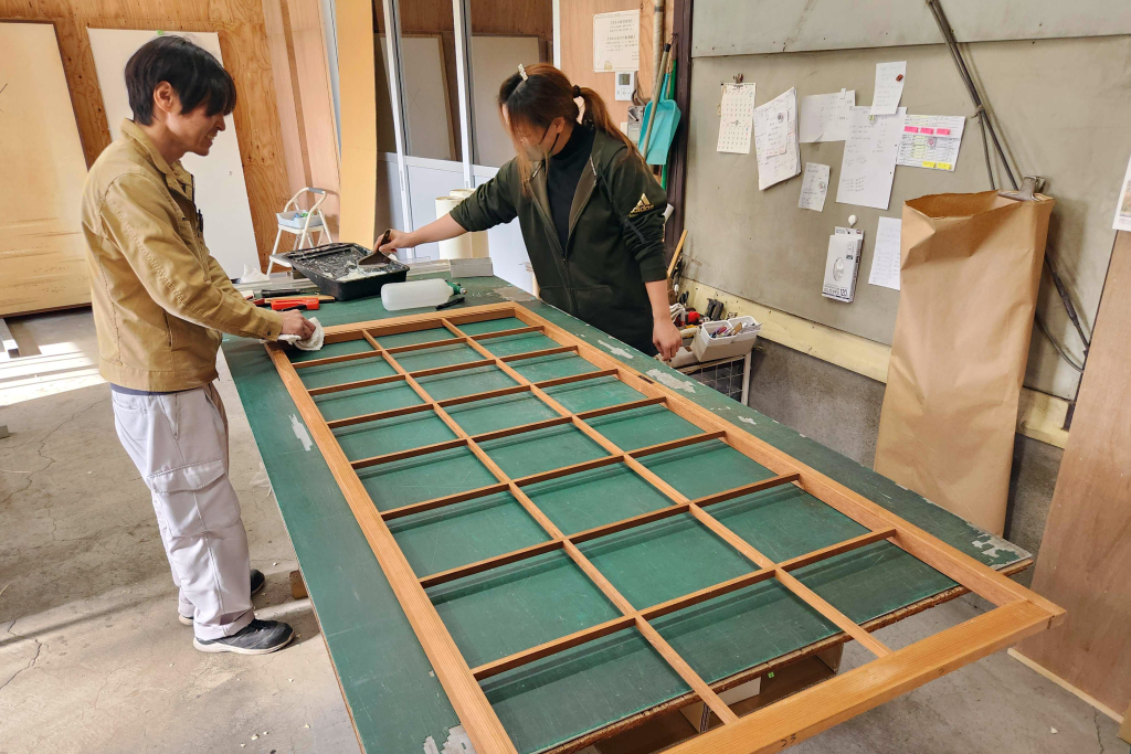 障子の張り替えも自社工場で行なっています。日の光をやさしく吸収してくれる障子はカーテンのようなお洒落さはないかもしれません。しかし、そこに粋を感じながら、伝えながら、施工しています。